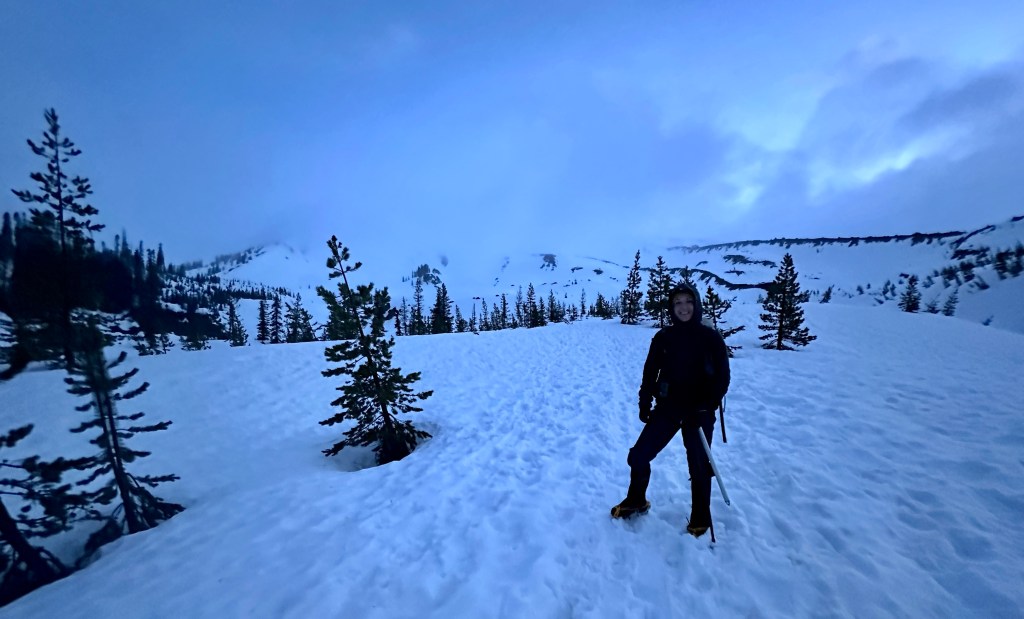 Well, now it was time to make it further than I ever had before when it came to climbing Mount Saint Helens – arriving at the trailhead! We climbed up in elevation towards Marble Mountain Sno-Park, the start for the winter climbing route. The snow started piling up higher alongside the road, and excitement was high. Except for the rain. Sigh. After setting up for the night, packing the packs, and a Cinco de Mayo celebration with al pastor and other yummies, we hit the sleeping bags for a few precious hours of sleep before our 2:30am alarms.