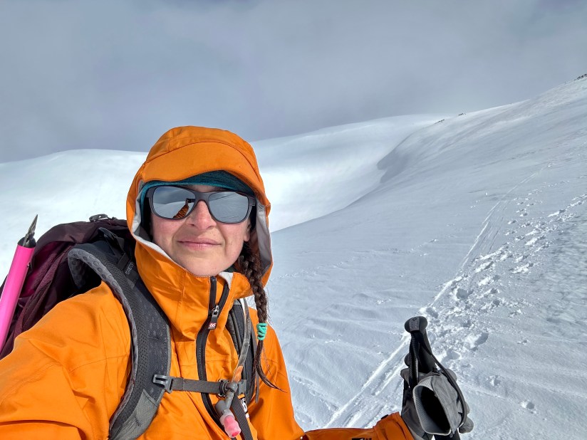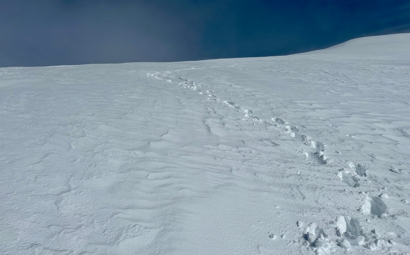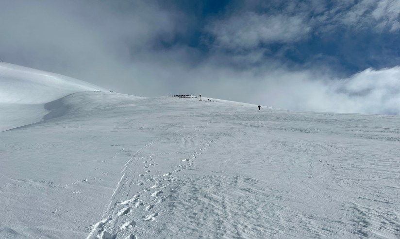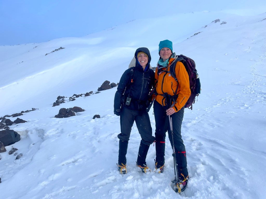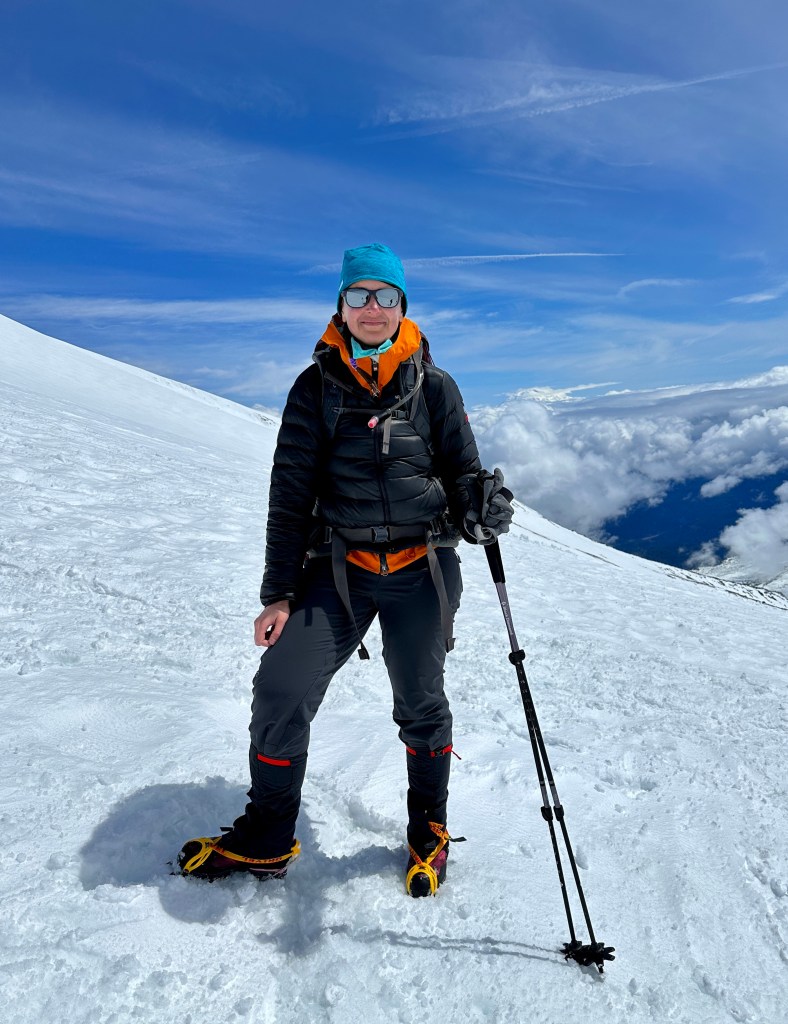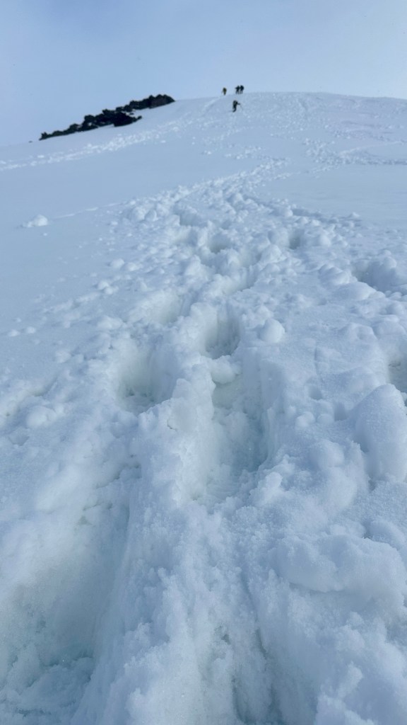 With varying conditions with ice and slush, I winced every time I could not place my foot straight into a kickstep. Any pressure on my heels made me gasp and cuss. I exchanged greetings with some skiers bootpacking their way up, and took to following their more straight up approach than Jen’s switchbacking path. I took to side steeping. Within sight of the summit the sobs came, which I had been suppressing for hours. Let’s get this sh!t done I thought, and I power walked up the last bit until I hit the crater rim, where I sat down to dramatic sobbing (which I don’t suggest doing without warning, as you’ll freak out your climbing buddy!). FINALLY.