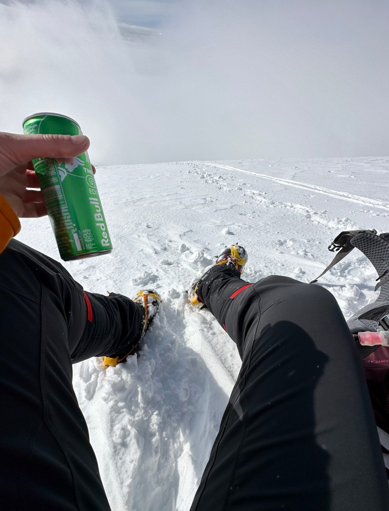 With about 1,300 vertical feet to go, I took a break to sit down for the first time all day, eat a snack, drink a Red Bull, and apply sunscreen. Let’s go do this final hour and change!