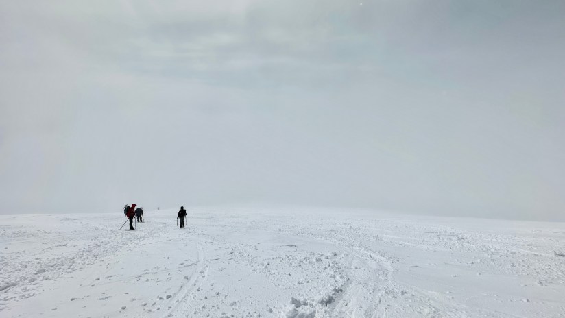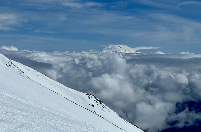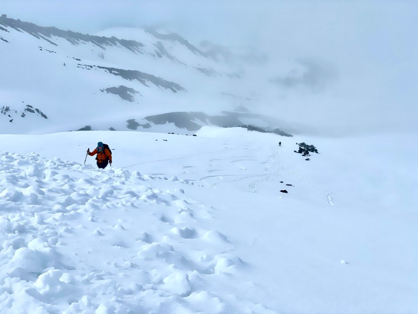 The low clouds came and went, and sometimes visibility got pretty bad which made me nervous as I fought to see Jen ahead of me. By now we were the first two heading up for the day on foot (one skier was alongside Jen), with Jen breaking fresh trail. From the group we passed at the seismic station, a girl caught me and said “I think your friend is standing up there on the summit!” This time I got to be the heartbreaker and tell her we still had 2,000 vertical feet to climb before reaching the summit. Her face wrinkled, and she whipped out her phone to check the map as I continued the upward trudge.