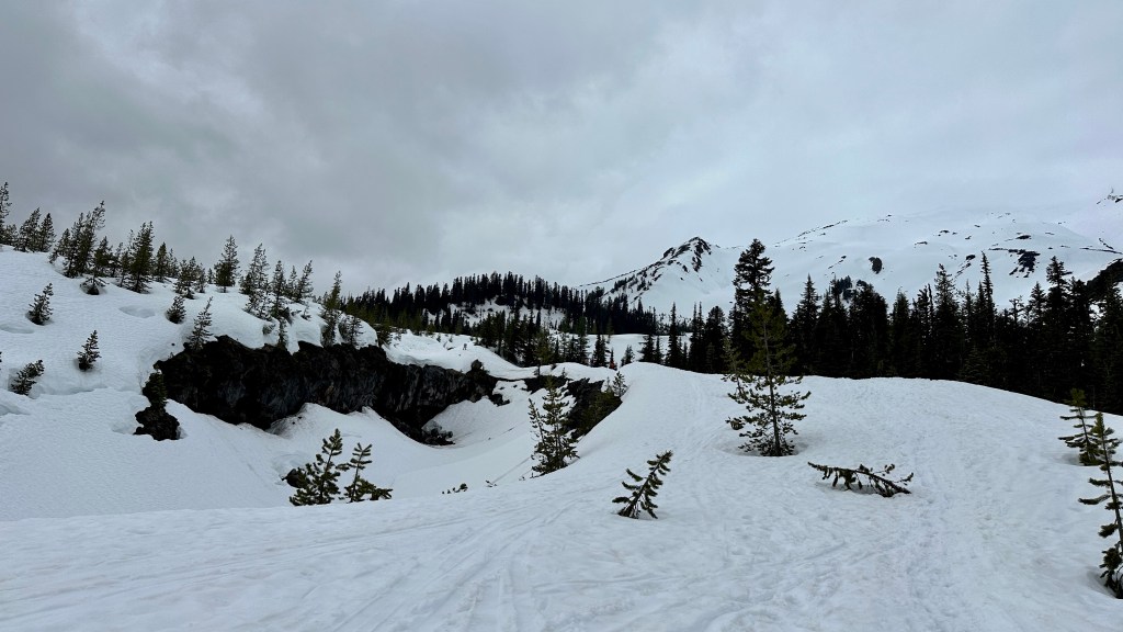 We finally reached our ditched snowshoes at treeline, still safely stashed in a treewell. Now the nearly three mile march back to the parking lot… always the worse part of the hike, but more so after this whole adventure. I thanked myself for flying with my snowshoes to make it easier. I quickly caught up to Meredith and Eric after Chocolate Falls, and we walked steadily with purpose back to the parking lot.