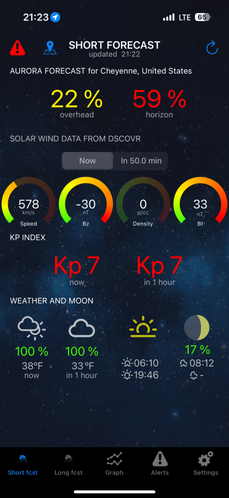 Living at 41.14°N does not lend itself to many aurora borealis, or northern lights, sightings. All my times seeing them had been in Iceland, or en route to Iceland on the plane. So when a mega geomagnetic storm (coronal mass ejection) made it possible to have a KP index of 8 in Cheyenne, Wyoming, on April 23rd, I quickly jumped off the couch, gathered up my camera, and headed north of town!