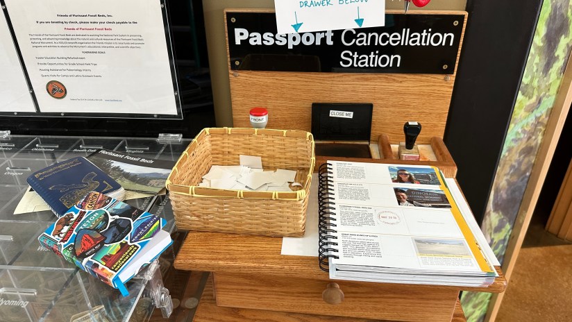 I parked and gathered my three passport stamp books and headed to the visitor center. You must show an interagency pass (such as America the Beautiful) or pay the fee upon entering. I briefly wandered through the impressive visitor center exhibits, which detail a lot of the geology and paleontology of the area, before heading back to the car and ditching my goodies.