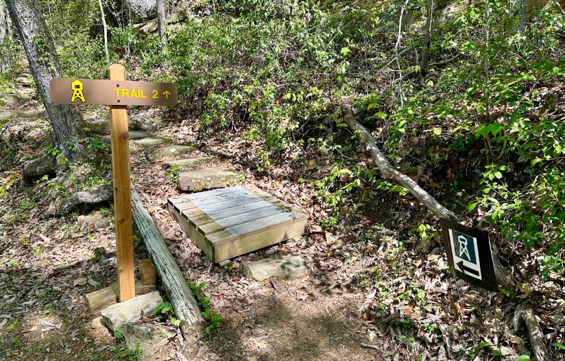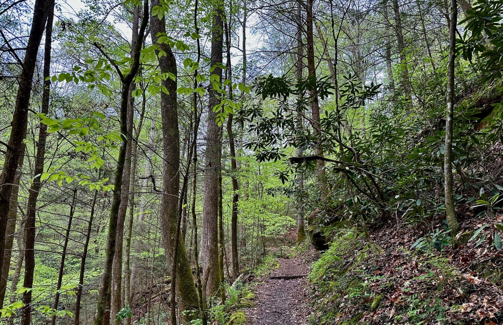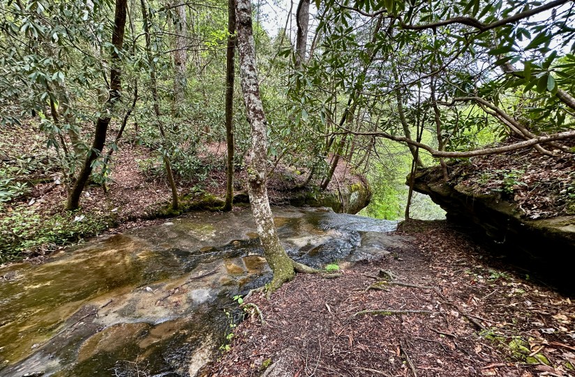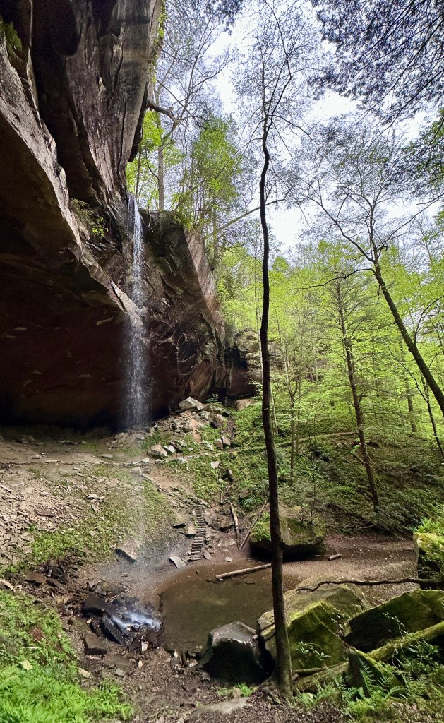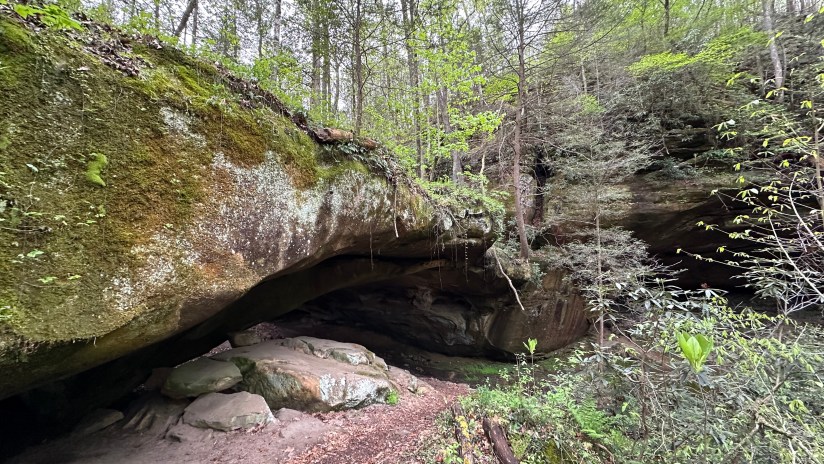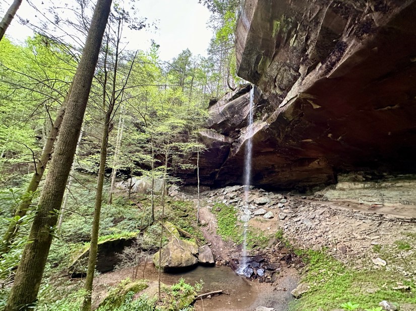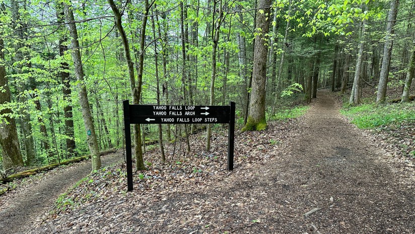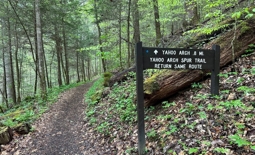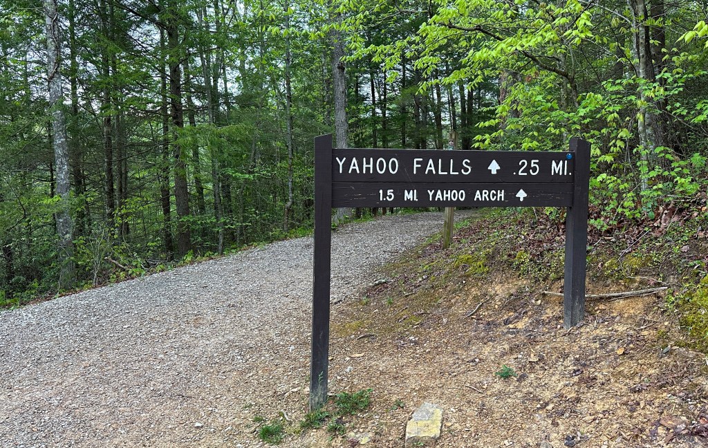 At 113-feet tall, Yahoo Falls is an easy hike, just a bit over one mile round trip. I decided to also add on Yahoo Arch, a natural arch a bit further up the trail for some bonus miles. The trailhead has nice bathroom facilities and many picnic sites, with lots of parking (at least at 7:30am on a spring morning). A map of this section of the Big South Fork NRRA can be found here.