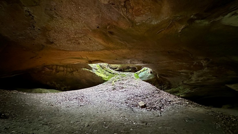 I made quick work of the wide path towards Yahoo Falls, and opted for a clockwise route, descending the steep metal staircase that would lead to the base of the falls, and the large sandstone rockshelter behind the falls. It’s not a secret that I am obsessed with waterfalls, and I have been fortunate enough to experience some amazing waterfalls in my travels. Though Yahoo Falls is not the biggest, tallest, most powerful one I’ve been to, its setting with a large rockshelter and dense forest made it magical!