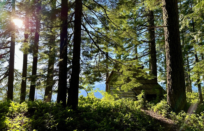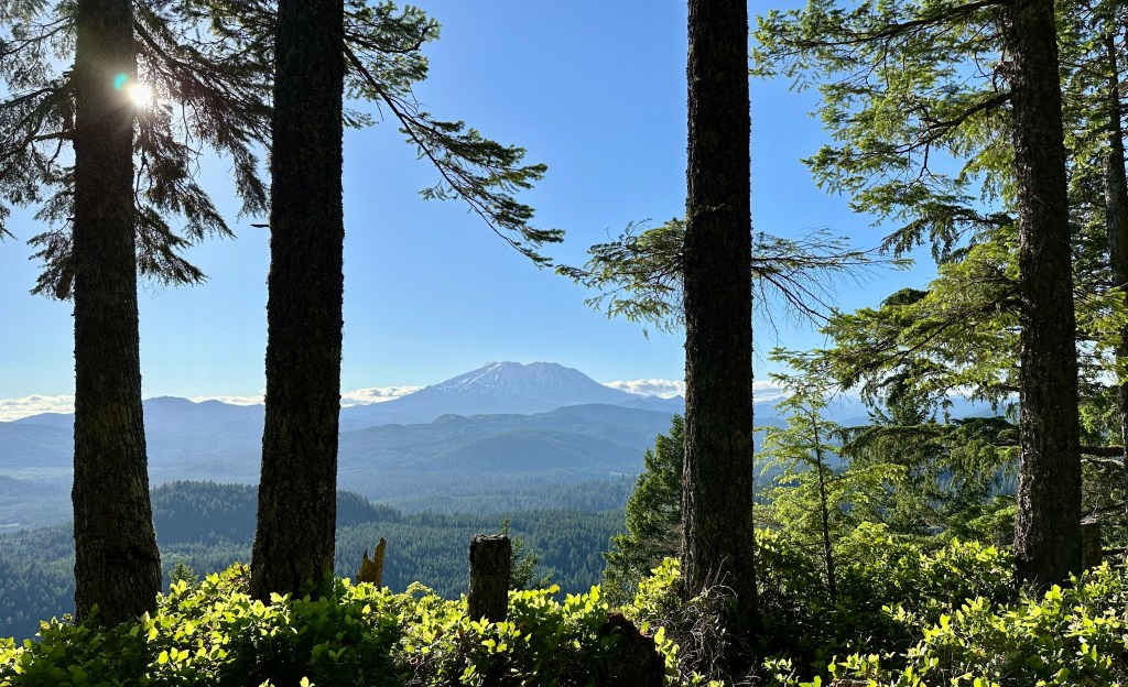 Finally near the end of Forest Road 9310-240 we parked and started out on a super short trail that led to the summit of House Rock, and the location of a three-sided Adirondack shelter built in 1935 that served as an emergency fire lookout (the shelter was restored in 1991). Mount St. Helens greeted us to the northwest as evening sun flittered through the leaves. It was well worth the forest road adventure!