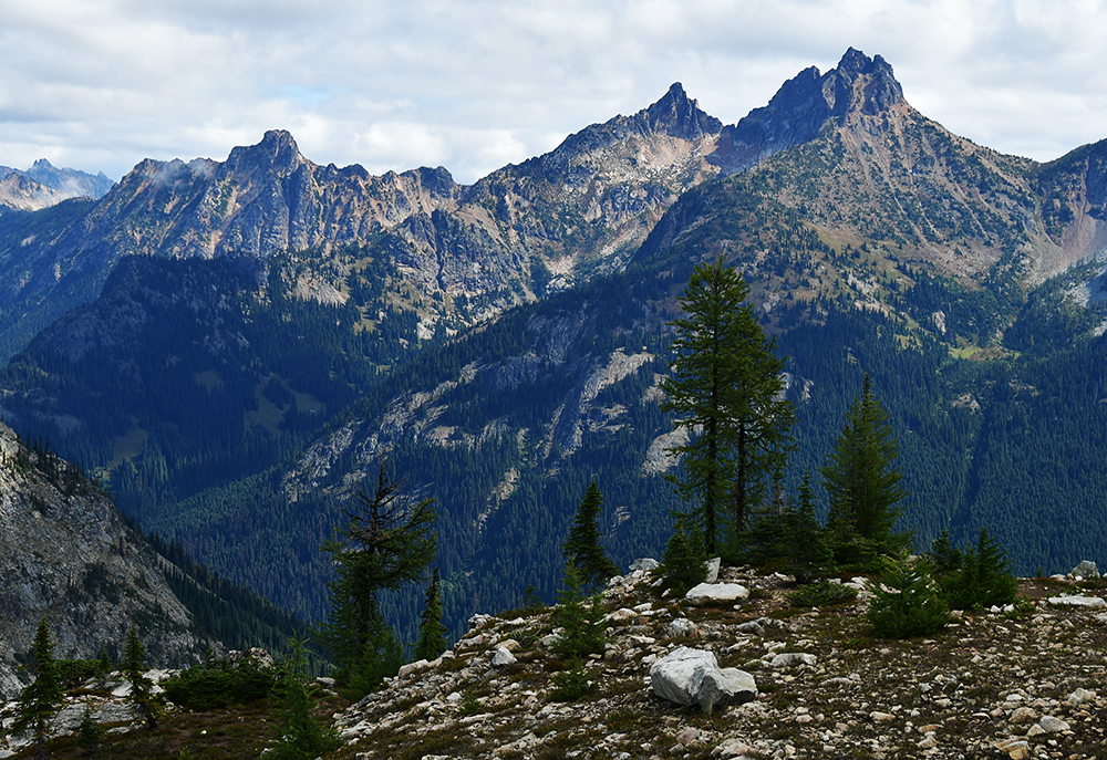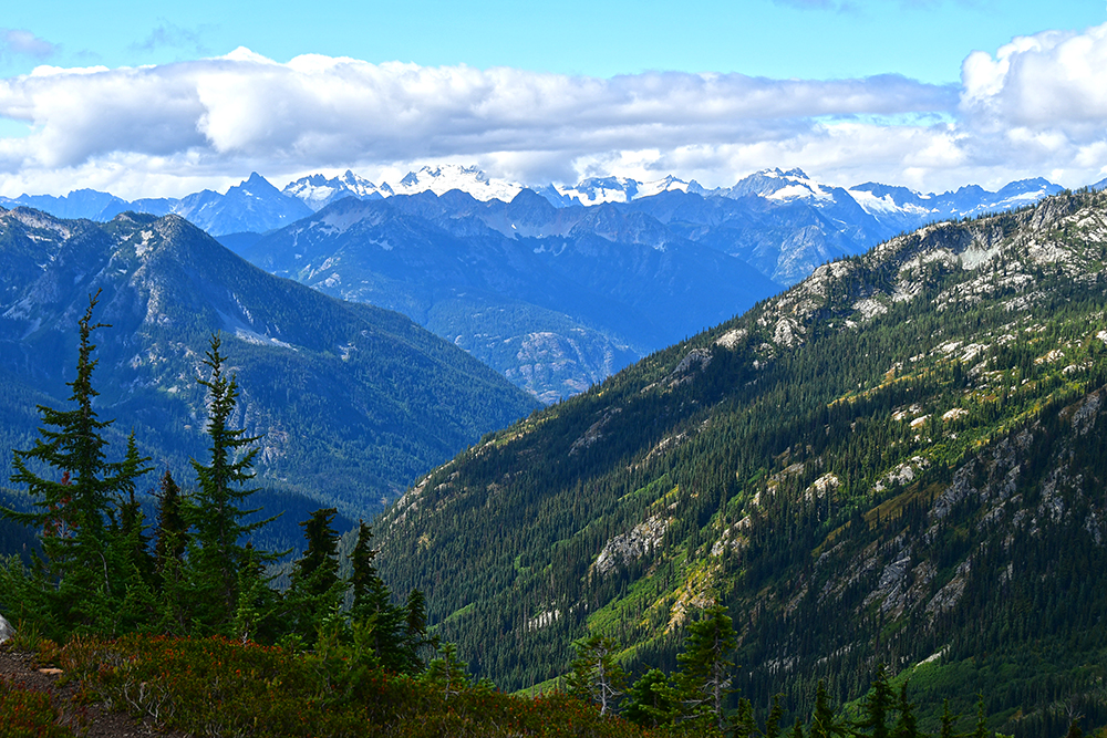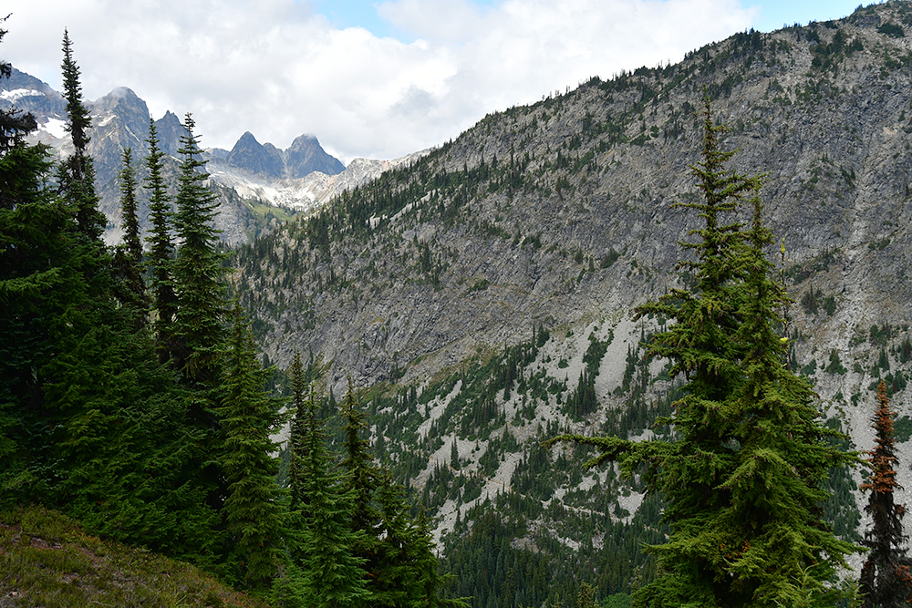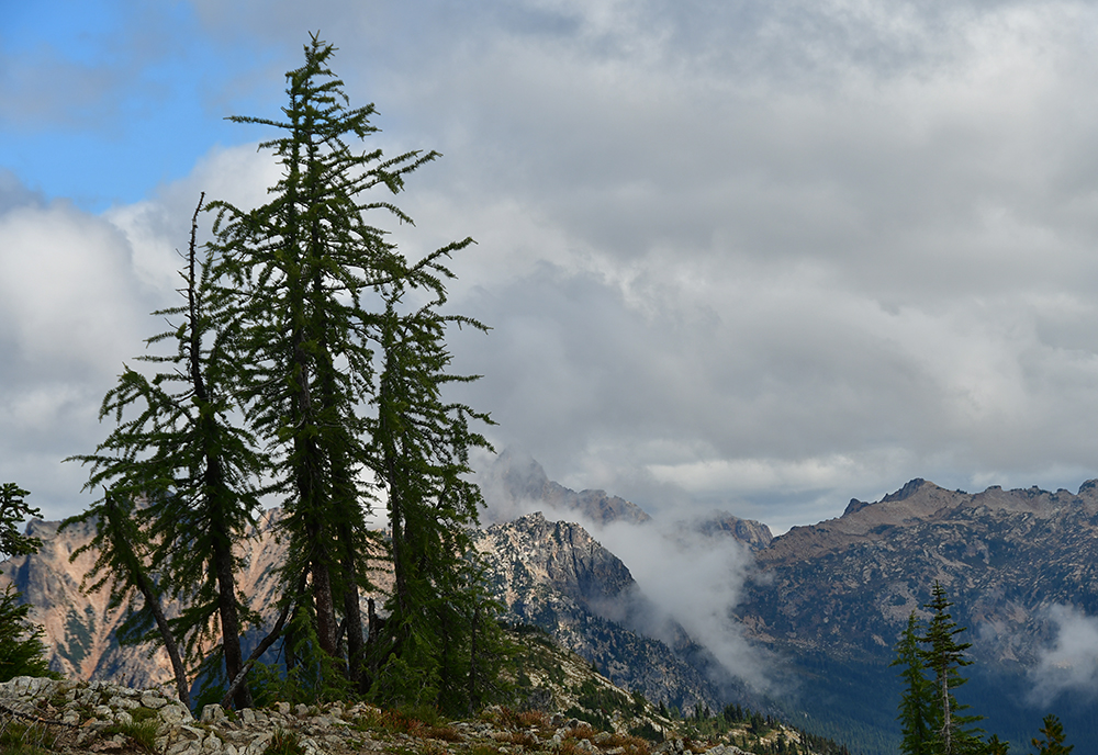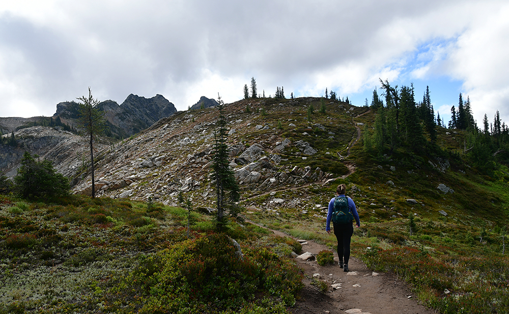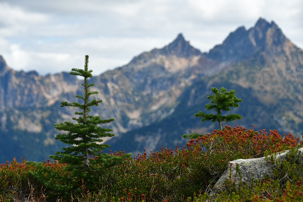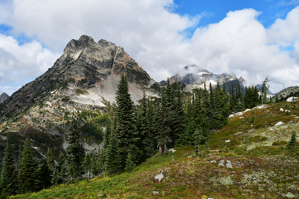 After the junction at Heather Pass, there are a few switchbacks as you continue up to Maple Pass, eventually breaking into the high alpine zone where stunted trees and shrubs mark the scenery. Frost and dew still glistened on some of the foliage, and clouds graced the summits of the mountains around us.