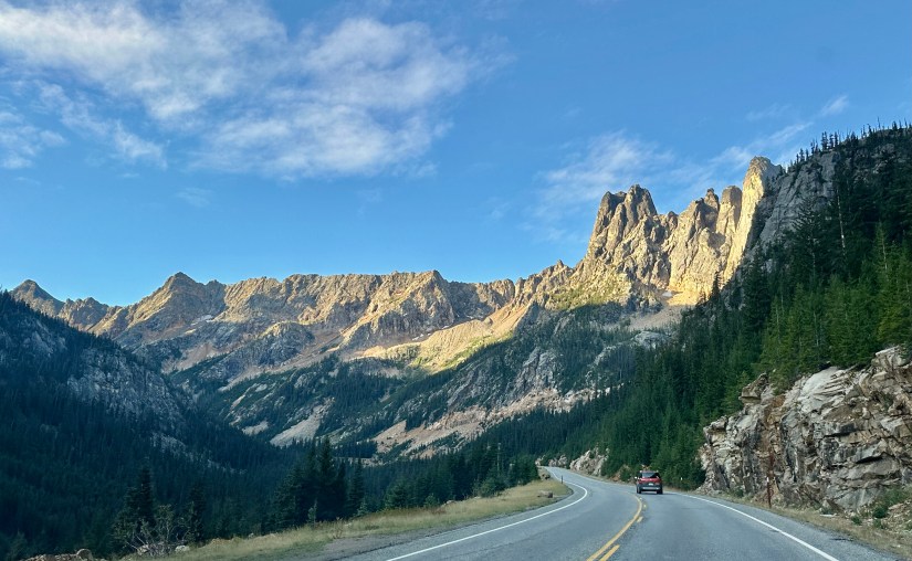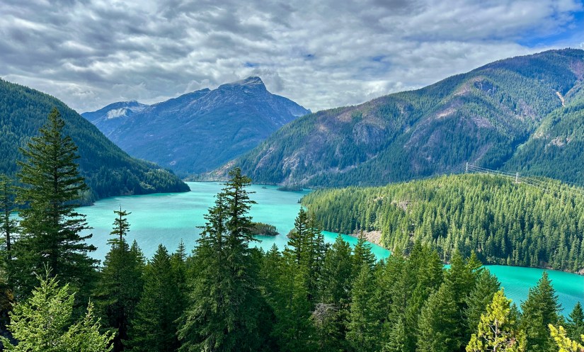 Janice and I made the stop at the Diablo Lake Overlook on our way west. Diablo Lake is a stunning teal color thanks to glacier flour (suspended rock particles that reflect sunlight). This is definitely one of the more popular stops, and definitely was a bit peopley! Also very windy!
