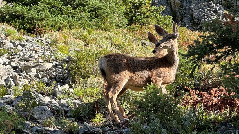 We crossed through beautiful meadows, as we gently climbed. The trail broke from the thick trees above Lake Ann and traversed the steep hillside. Though it was late August, some wildflowers were still to be found. A few deer were grazing on the side of the trail, including one that acted as our tour guide and led us up the trail a ways.