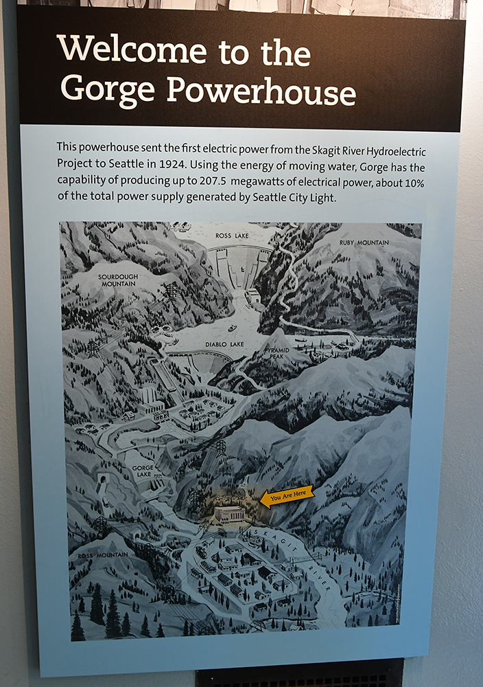 Though you can just head to Ladder Creek Falls and back on the same trail, Janice and I took the small loop that wound through the old gardens and down to the Gorge Powerhouse, which has an exhibit area. Earlier in the trip I was talking about my recent visit to Bonneville Dam and trying to explain the massive turbo-like structures of the powerhouses, so I was excited Janice would be able to see inside a powerhouse!