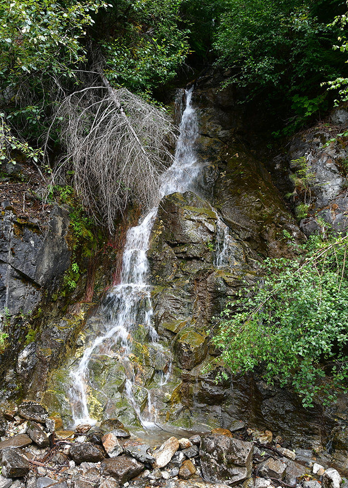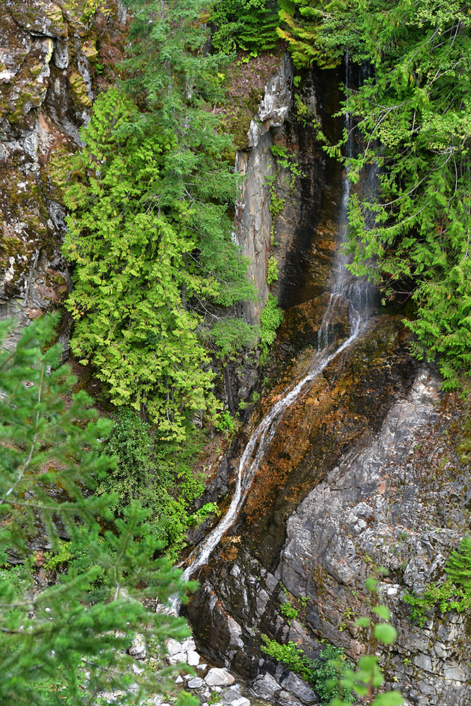 Gorge Creek Falls just down the highway was our next stop. This waterfall cascades 242 feet down into Gorge Lake, and is viewed from the roadside. There is a short trail (less than a mile) that lends some views to Gorge Lake and Dam that we wandered.