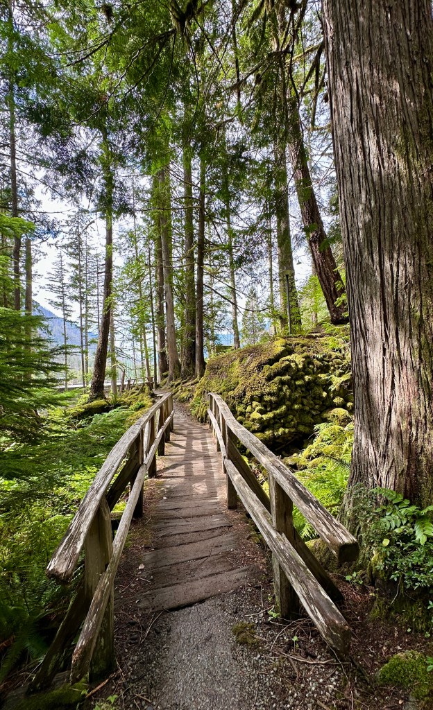 We parked and set out to the 108-foot waterfall. I tentatively made it across the suspension bridge over the Skagit River, announcing how I deserved a gold star for bravery – honestly, the bridge was probably the best suspension bridge I had crossed, as it wasn’t too wobbly or bouncy. But still, I was over water. Yikes! We stopped to read interpretive signs along the way, learning how JD Ross heated the ground so tropical garden could be planted and designed a lightshow.