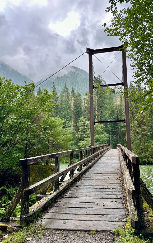 The trail gently switchbacked up a short hill (the elevation gain on this hike was negligible compared to what we dealt with a few days prior on Maple Pass) to Hidden Creek. A whimsical, curvy bridge awaited to carry us across the roaring cascades. Definitely a highlight of the hike!