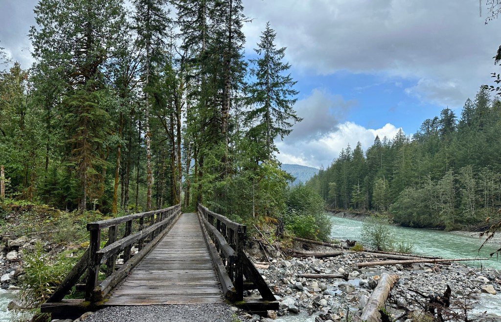 The Baker River Trail leads all the way into North Cascades National Park and Sulphide Creek. However, after about a half mile, we reached the Baker River suspension bridge, and the Baker Lake Trail. Hoping to catch some glimpses of Baker Lake through the trees, we turned onto Baker Lake Trail.