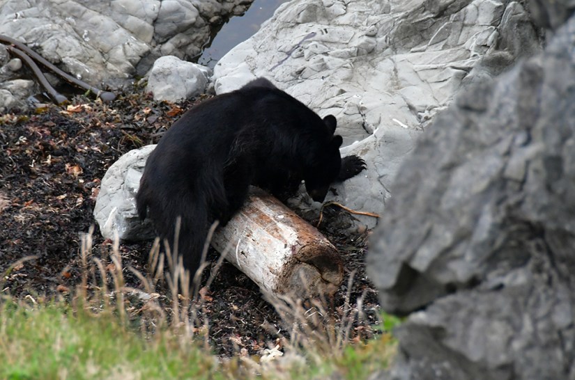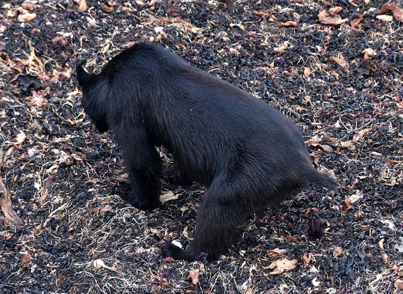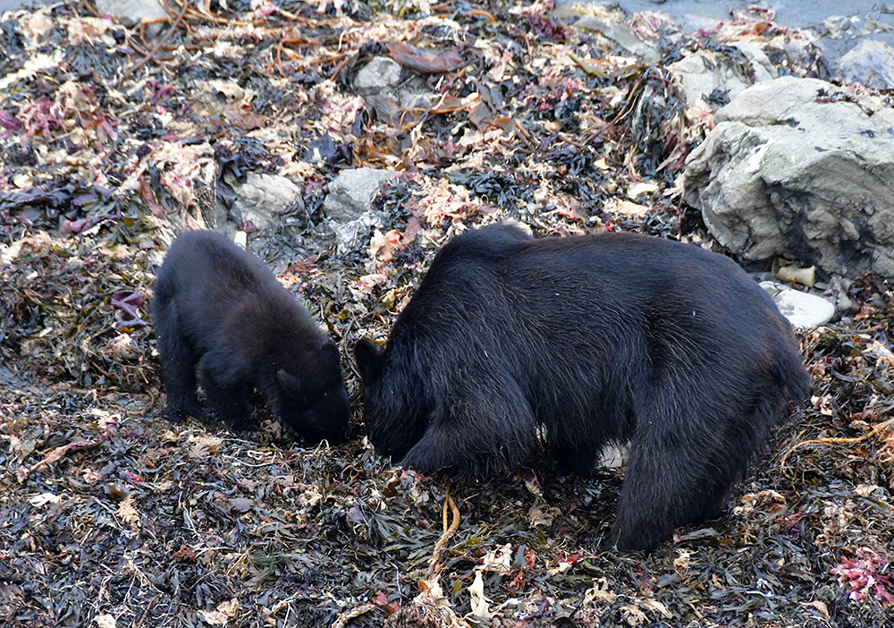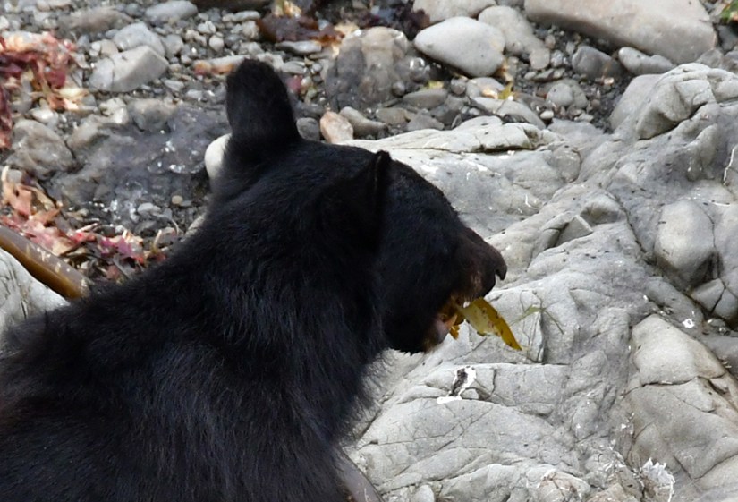 As we headed back to camp, we were stopped by some people that warned us a black bear and her two cubs were just right around the corner and visible from the top of Sand Point. BEARS!! Janice and I headed up the hill and were treated to a show as mamma and babes dug for dinner under the seaweed. This is definitely the closest I have been able to observed bears (aside from the time I drove right past famous 399 and her cubs in Grand Teton National Park), and was such an amazing experience. Thank goodness for digital cameras, because my shutter finger was kept busy as I snapped photo after photo. Also thank goodness for a 300mm lens… these photos make it appear like I was much closer than I actually wise. Don’t worry, I was a safe viewing distance away! Hauling the heavy DSLR set up was beyond worth it!