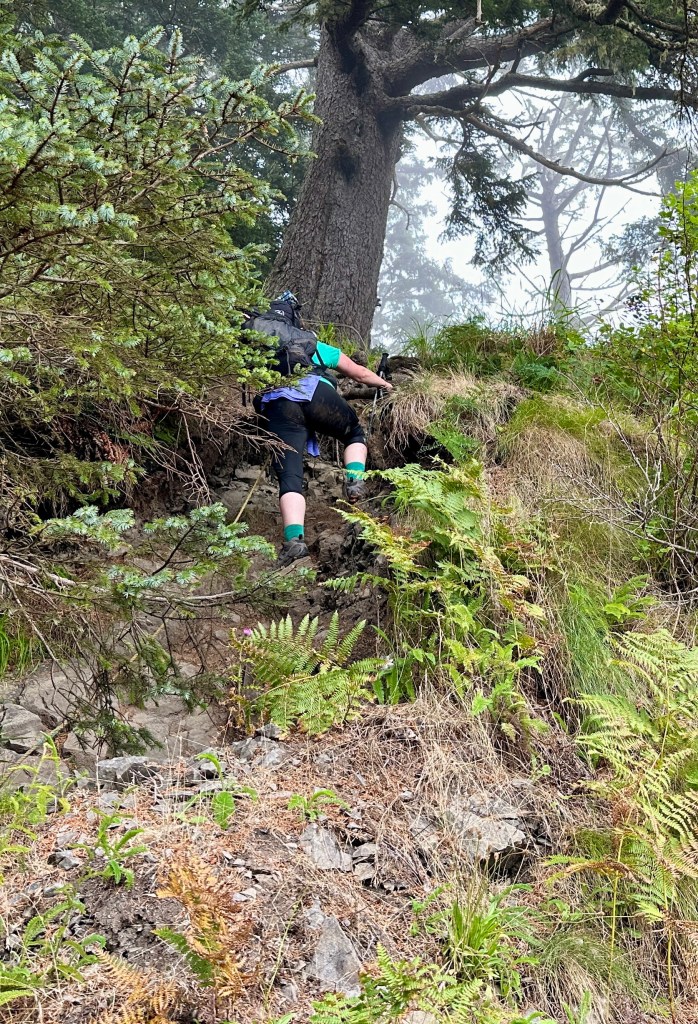 “Well, this is sketchy,” I announced as I chose the rope to my left and tried to figure out how the lower myself down the muddy embankment that was eroded beyond vertical. I decided to trust my puny arms, and “repelled” down without being harnessed in and just hoping my arms would hold out. I chose wisely, as the rope to the right ended about twenty feet off the ground. Once down, I coached Janice safely back to earth. I was so damn proud of Janice for conquering this headland trail, as it was something she had never tried before and she did it wearing a heavy pack!