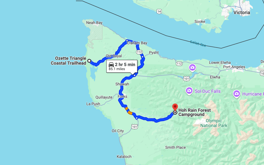 - ~85 miles and 2 hours 5 minutes of driving (not including time waiting to enter Hoh Rainforest)