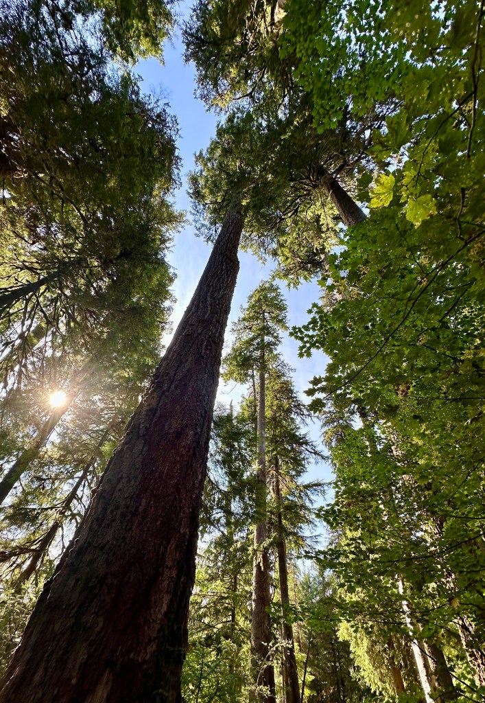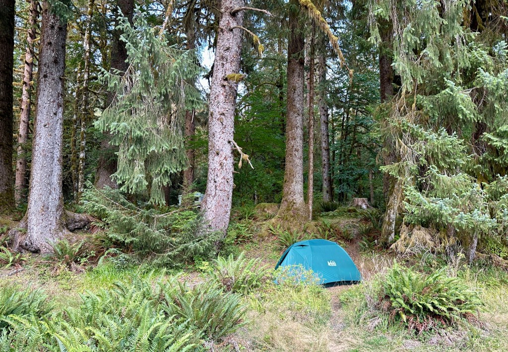 First up was finding our campsite and setting up camp. The campground is an easy walk from the visitor center and trailhead, so when we headed out for souvenirs and passport stamps we did not need to drive. We learned the superintendent of Olympic National Park won’t allow the visitor centers to sell the cute little stuffed banana slugs because they’re not anatomically correct (eyes are on the antenna in real life!) from a ranger, and we learned about the variety of slugs found in the area. I’m not one for slugs, but I was becoming more brave on this trip on all things slugs! I really was hoping to buy a gigantic stuffed banana slug, so I grumbled far too much for a 40 year old about the superintendent thwarting my hopes and dreams (I bought the small size earlier this summer at Mount Rainier National Park, where they are not as worried about anatomical correctness).