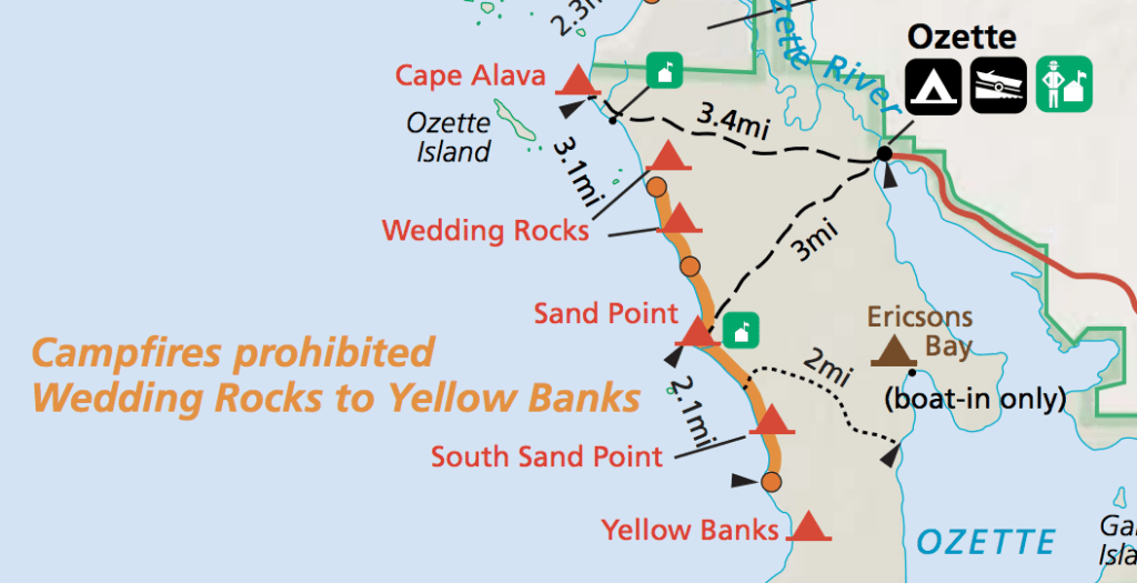 Campfires are prohibited between the headland north of Yellow Banks and the headland at Wedding Rocks. This includes Sand Point & South Sand Point. Fire restrictions may be in place for other campsites as well. In September 2024, Cape Alava was part of the park-wide campfire ban.