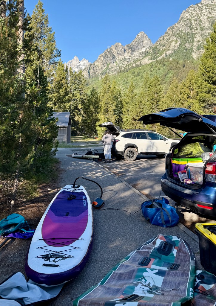 I chose the String Lake Canoe Launch as the beginning of the adventure, but one can use the String Lake Trailhead and Leigh Lake Trailhead to launch their non-motorized watercraft of choice. The canoe launch had the nicest path down to String Lake I felt. The early arrival meant securing easy parking in a shady spot, and a slow-going morning routine of inflating the SUP, drinking coffee, and eating breakfast could occur before hours spent on the water.