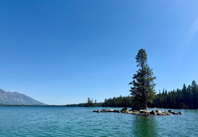 I spied a few cute “islands” in Leigh Lake I paddled towards first, consisting of solitary trees and wildflowers. Though sometimes shallow, Leigh Lake is much deeper and colder than String Lake, so I applied my PFD (personal flotation device, or life jacket) as I do still have that strong fear of water. The wind was also creating choppy conditions, though it spelled a tailwind when it came time to head back to the portage location. I ended up sitting and kneeling most of the time while on Leigh Lake due to the choppiness.
