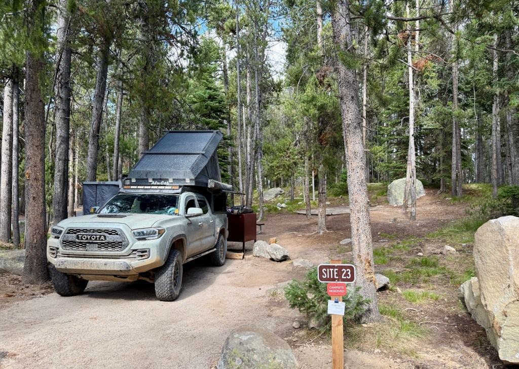 After acquiring my passport stamp (the Jenny Lake Visitor Center was closed during my visit in 2020, so first time!) and buying a sad $5 ice cream bar, I walked the loop up to the campground, where I had managed to secure a reservation thanks to an availability alert on recreation.gov. After scoping out the campsite, I checked in and took to managing the two vehicle situation. Jenny Lake Campground only allows one vehicle at all times at a campsite (and no RVs or camp trailers), so I had to drive to the campsite first, drop all my needed belongings in the bear bin, and then park in the overflow parking lot for the night so the other person along for the trip could utilize their roof top tent for their camping accommodations.