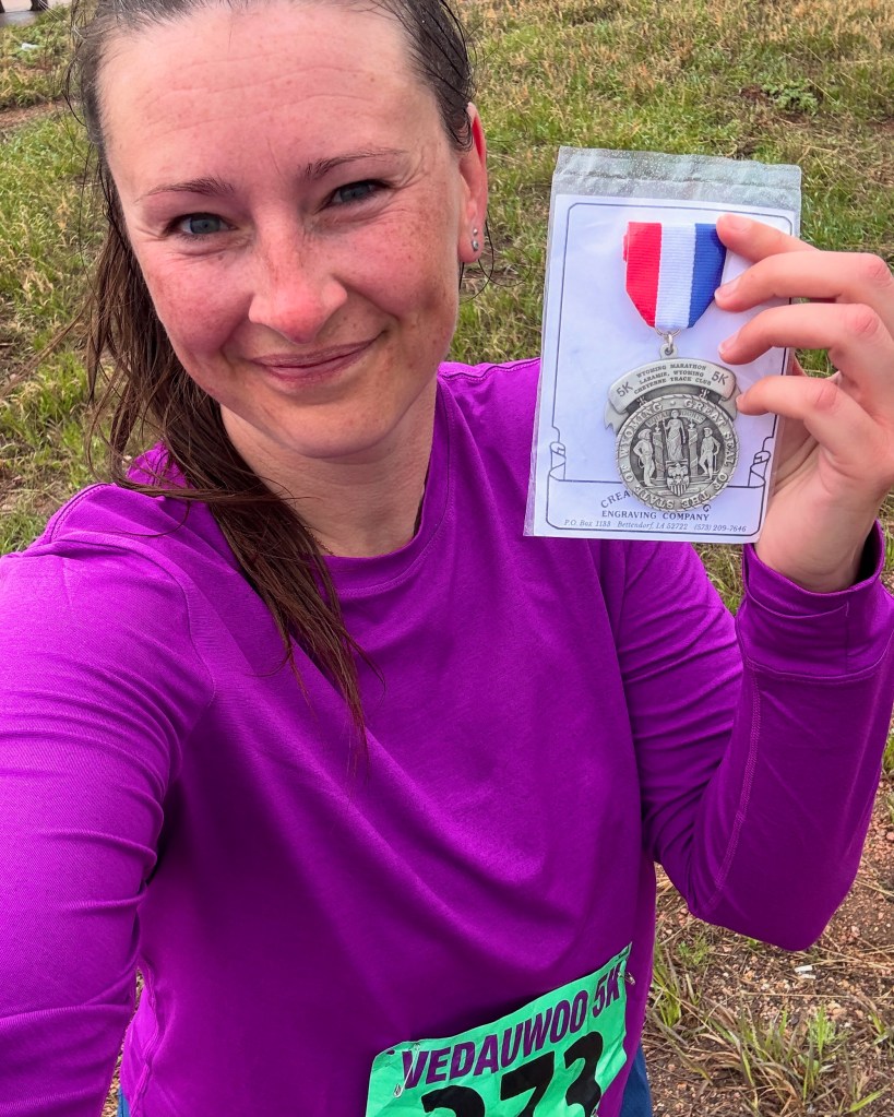 Apparently my half marathon did not teach me anything, and I found myself in the ten mile Silent Trails Memorial Race. I was dead last by a lot, and my MS made sure to remind me the whole race that it was there with pretty awful foot drop. I ended up walking the last several miles after I took a hard fall and cut my knee open. I was actually pretty embarrassed coming across the finish line as I felt so bad that everyone had to wait for me!